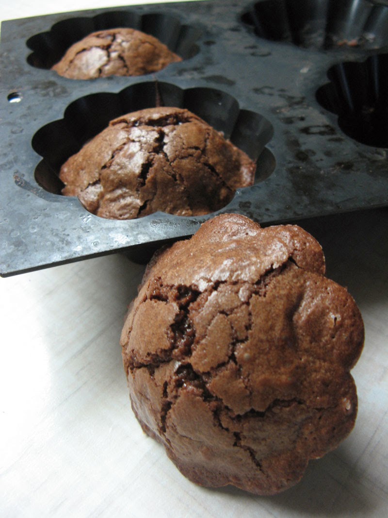 Шоколад розтоплюємо з маслом на водяній бані. Коли суміш стане однорідною, знімаємо і додаємо цукор, щіпку солі та ванільний цукор, вимішуємо. У теплу, не гарячу суміш додаємо яйця по одному, вимішуємо до однорідності. Потім додаємо борошно, ще раз добре вимішуємо і розподіляємо по формах для мафінів.